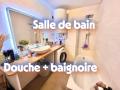 • Belle salle de bains avec baignoire et douche.